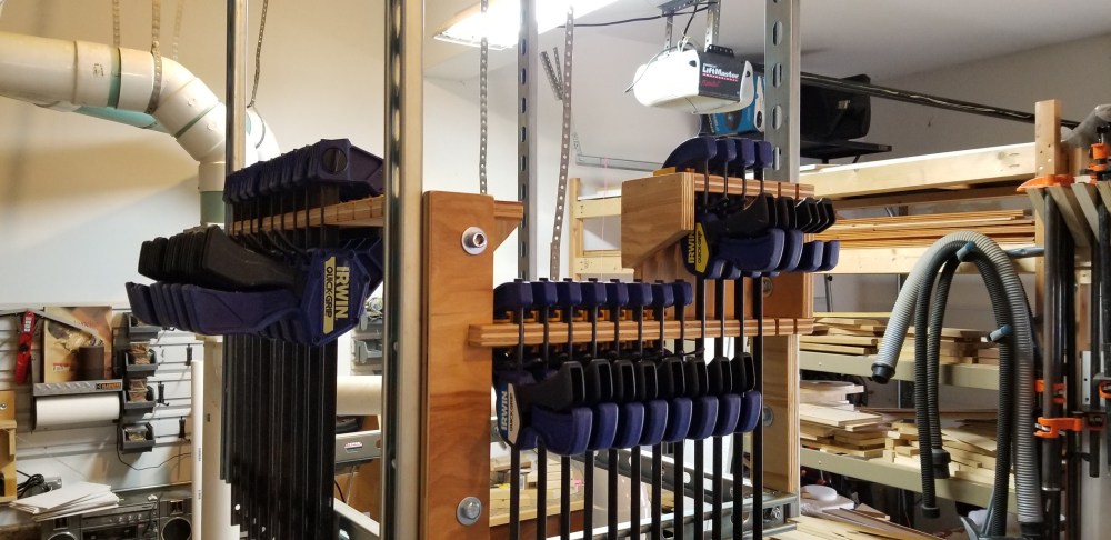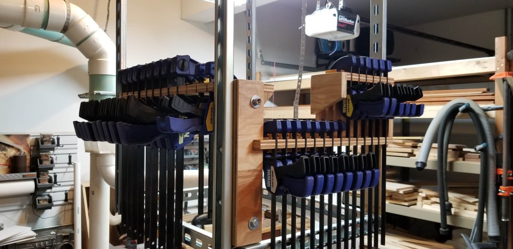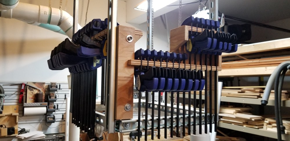 During the 2020 Covid-19 Pandemic, I began looking for projects that I could tackle with scrap wood around the shop. The first item I built was this hanging clamp rack. This rack is suspended from Unistrut channel on Unistrut dollies. This allows me to have an organized place to return my quick release clamps, and slide them away when not needed and then slide them to my project assembly area. Being able to move all of my quick release clamps to be readily at hand is very helpful during glue ups.