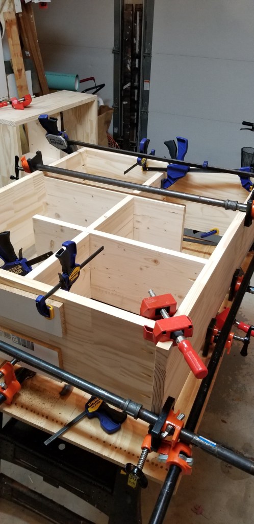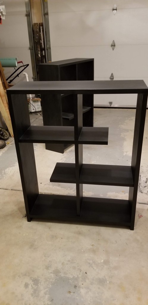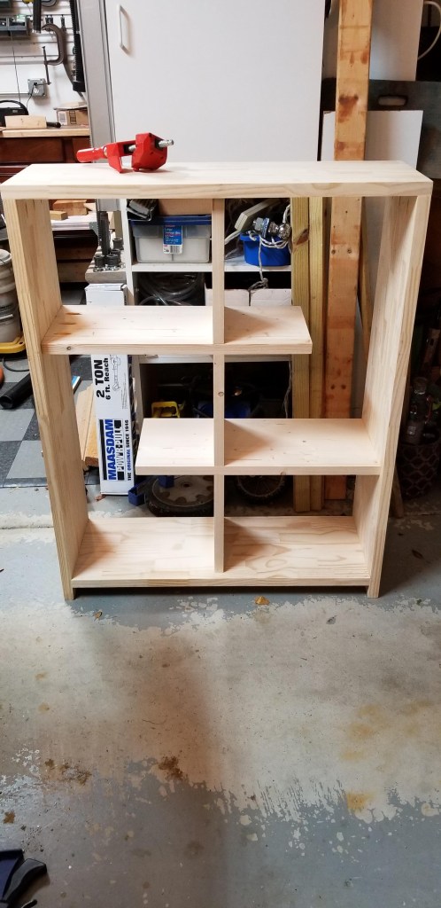 As my third contribution towards a work charity auction benefiting Girls Who Code, I again decided to double up a project, making one bookshelf for the auction, and one bookshelf to keep. As this bookshelf was going to be used in my office, I wanted a design that could flexibly hold books, a laptop bag, photos and decorations. I also wanted these bookcases to have more significant substance than normal one-by material. The glued up pine boards, once painted, turned out to give these shelves just the right thickness. Finished with layers of varying colors of gray in addition to an acrylic topcoat add to the durability.
