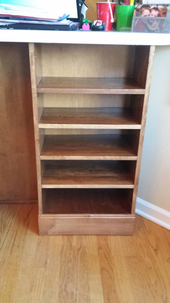 We were looking to add some additional organization space in our kitchen. On the back side of our counters, next to our barstools was a space that was a good candidate to add some additional shelves. These shelves are maple and stained to match our maple cabinets that we has refinished earlier.