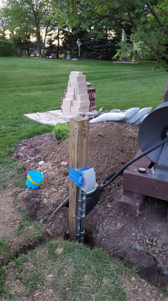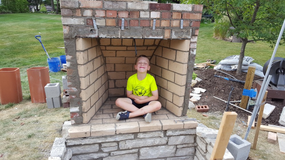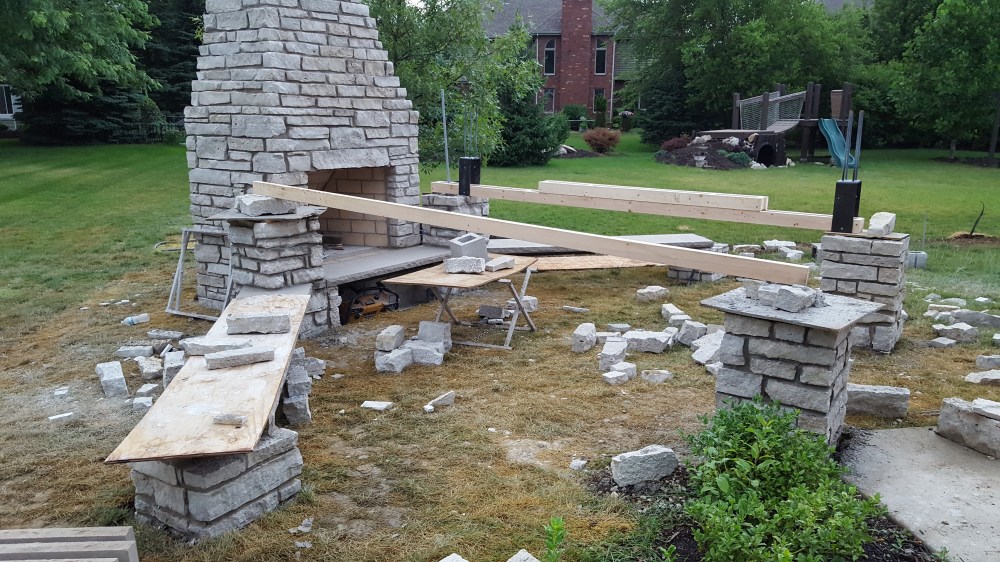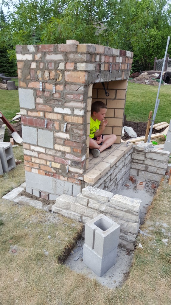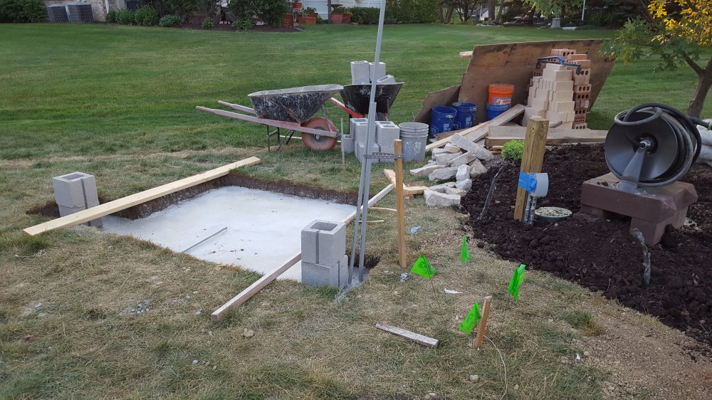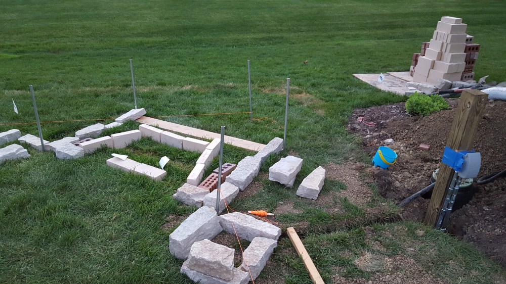 Once we had all the preparation complete with the water line, electrical, and speaker conduit, it was time for our fireplace! We talked about what we want, and our mason laid out the elevation in conjunction with our patio paver, who wanted to have a specific pitch from the house. Initial layout was an exciting time as we started to see how it would begin to change our backyard, greatly expanding our outdoor living space. One of the first steps was digging the footings for the six posts and the fireplace itself. Both the boys enjoyed the big hole while we waited for inspection. We actually left for the weekend when the concrete was poured and came back to all six posts and a huge base for the fireplace, to the boys dismay.
