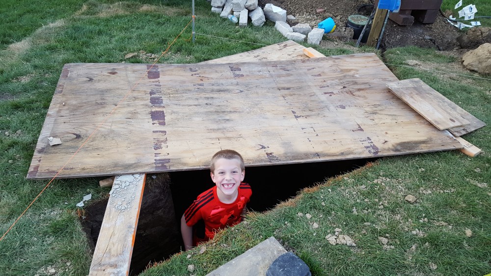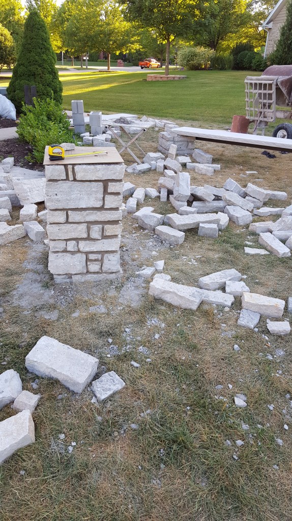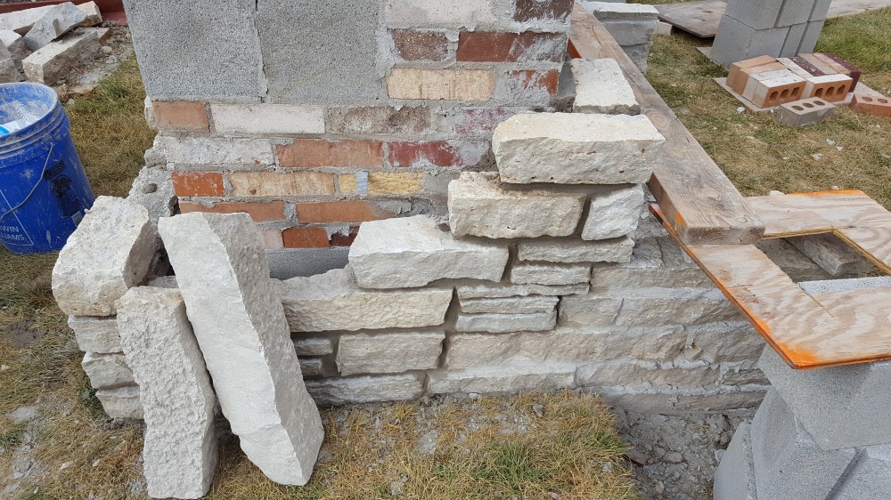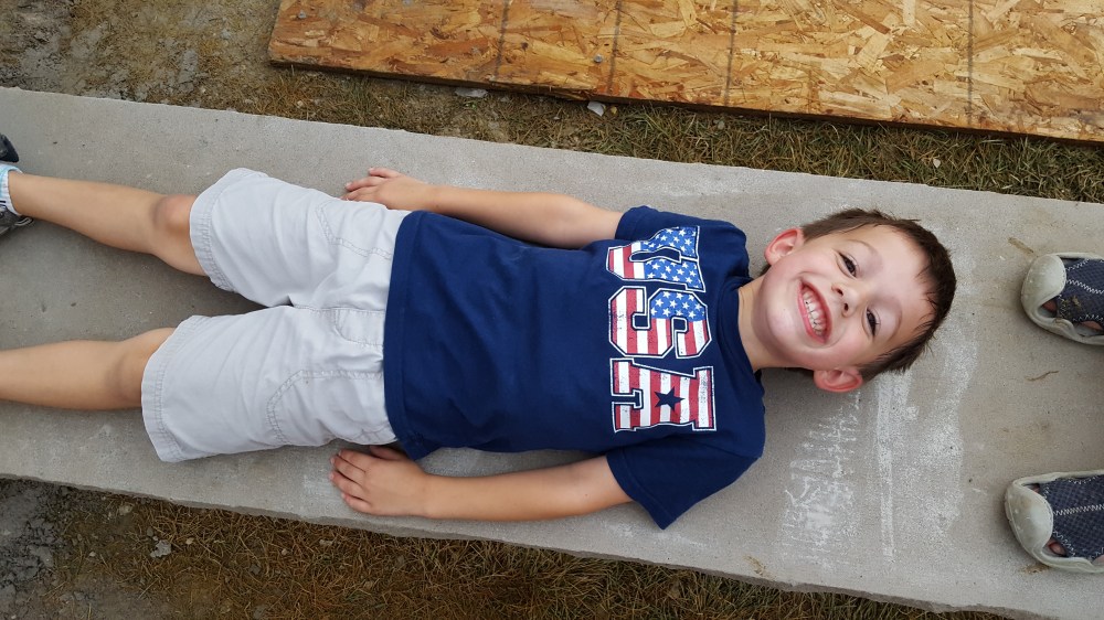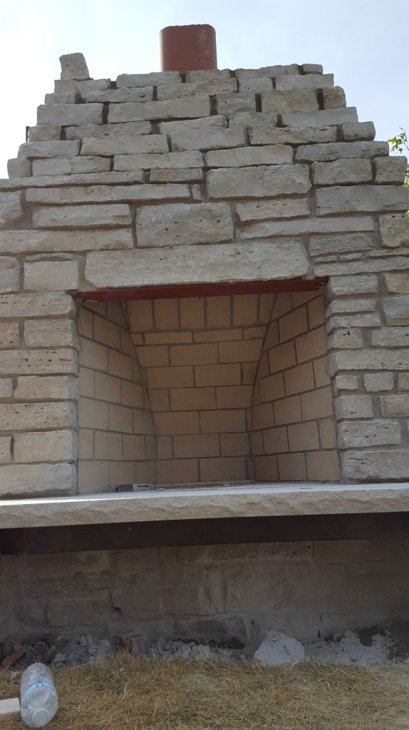 Once we had all the preparation complete with the water line, electrical, and speaker conduit, it was time for our fireplace! We talked about what we want, and our mason laid out the elevation in conjunction with our patio paver, who wanted to have a specific pitch from the house. Initial layout was an exciting time as we started to see how it would begin to change our backyard, greatly expanding our outdoor living space. One of the first steps was digging the footings for the six posts and the fireplace itself. Both the boys enjoyed the big hole while we waited for inspection. We actually left for the weekend when the concrete was poured and came back to all six posts and a huge base for the fireplace, to the boys dismay.