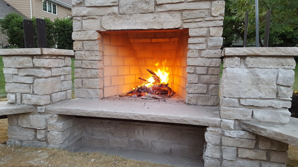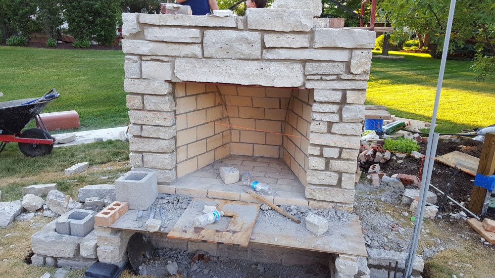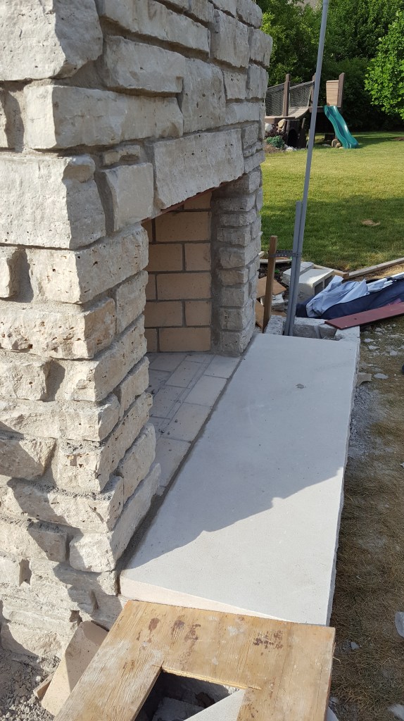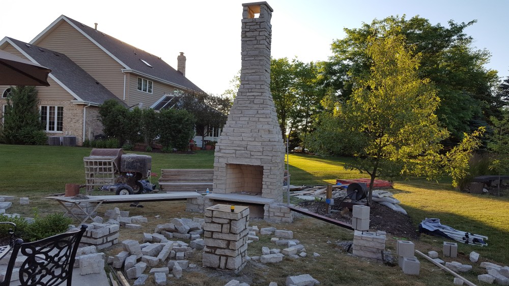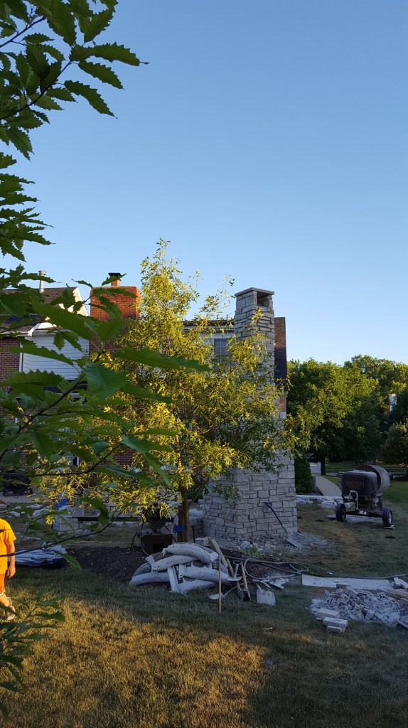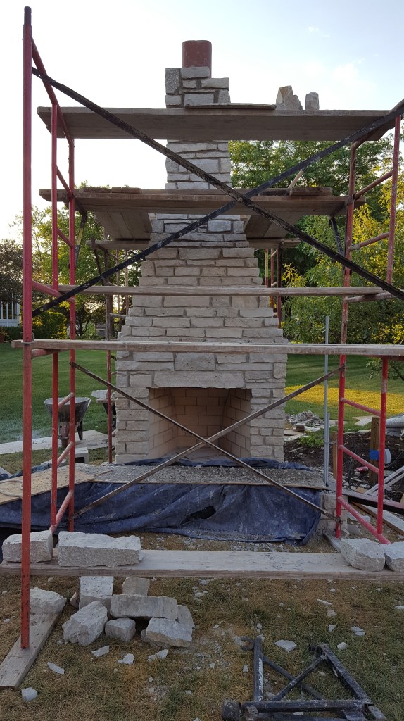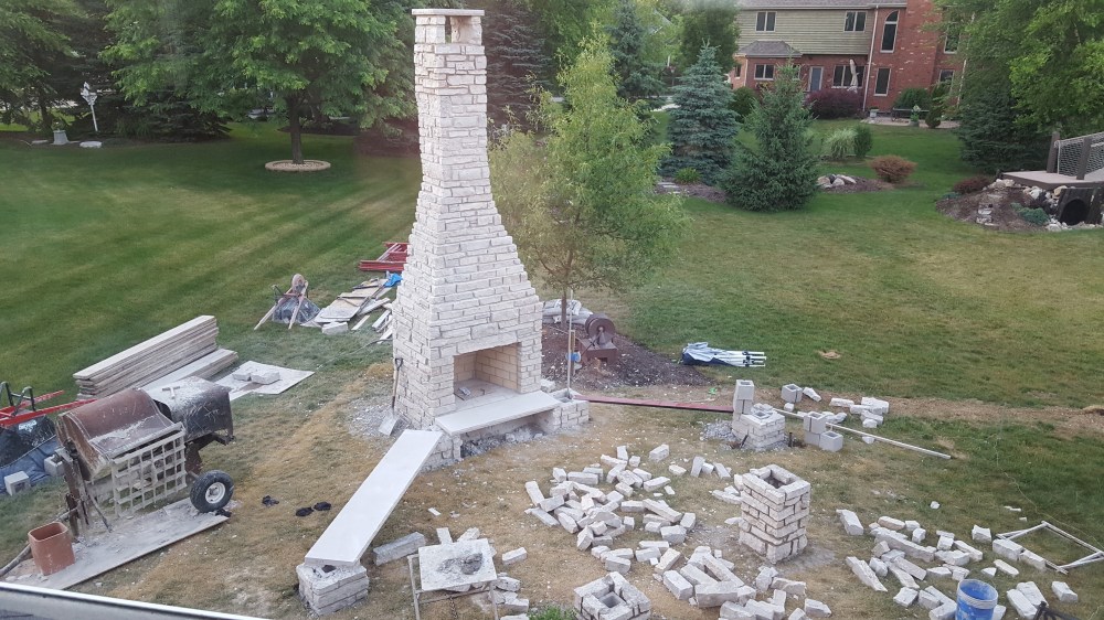 Watching the progress day-by-day was exciting, and coming home to yet another part of the work completed was fun. The stone was brought in from Wisconsin, and created the look we wanted that coordinated with our house. The massive stone fireplace soon rose above our yard, rising above the Oak tree a few feet away. Once completed, we enjoyed beers and a makeshift fire with the masonry crew. Serious progress, and a fireplace that really creates a perfect setting for a wood burning fire.