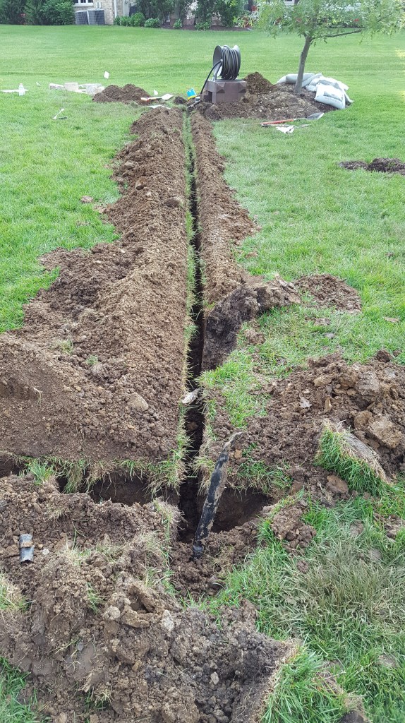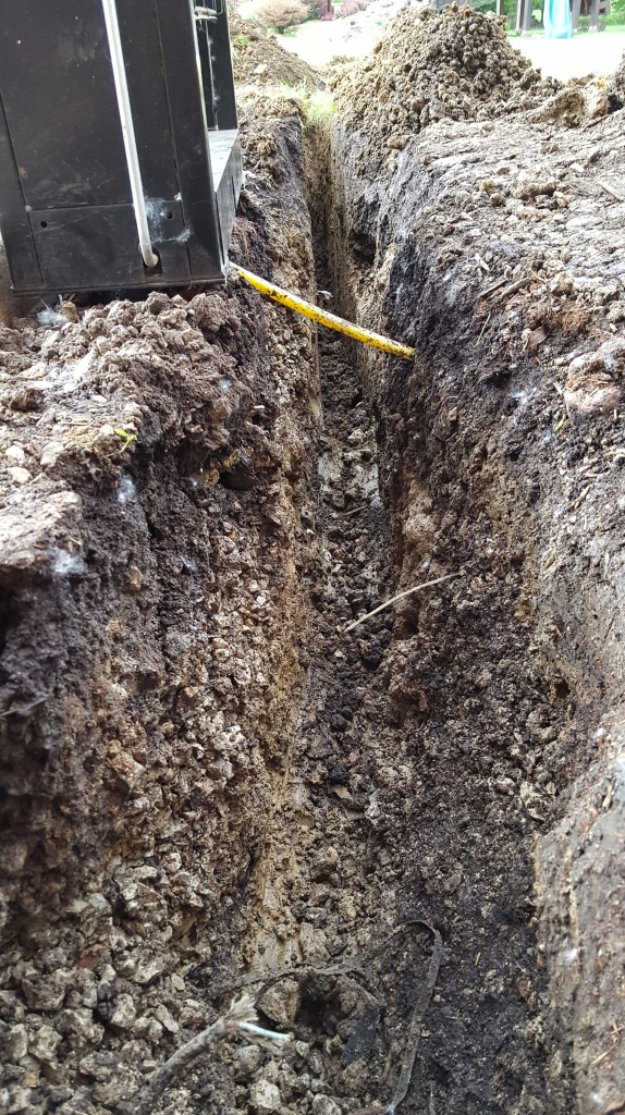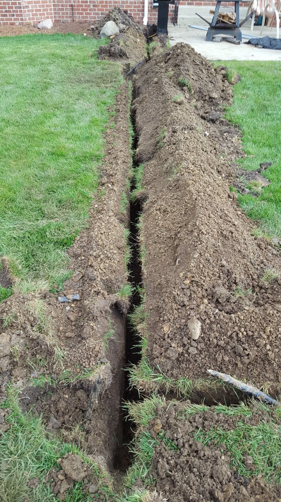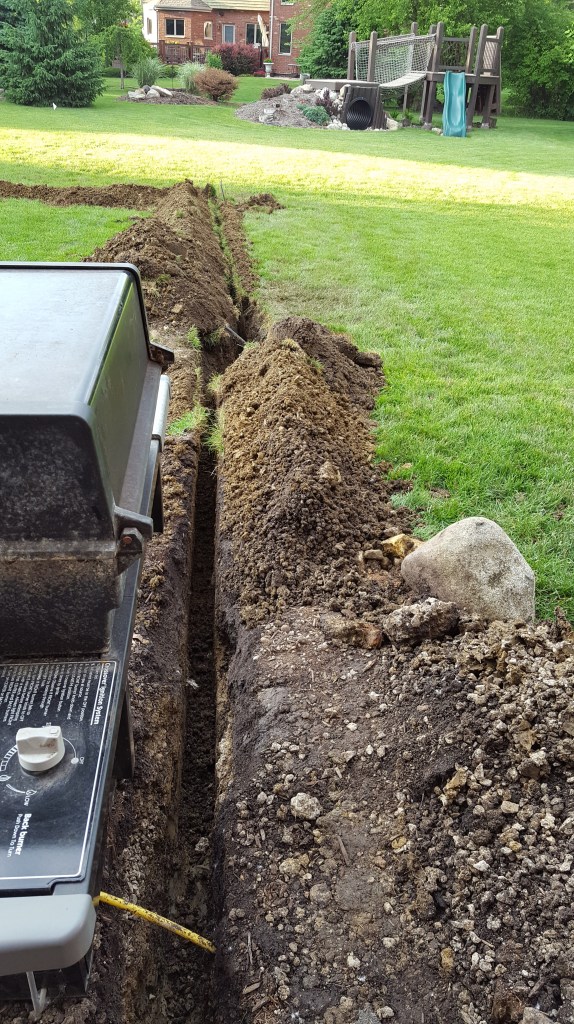 For our electrical, I needed to tie off of the outside circuit from our basement. I drilled through our foundation to exit the house. At that point, I need to cut a channel around the future patio and over to the back of the fireplace, where I would run up the column and throughout the structure. I rented a trencher hoping this would speed up the work. The trencher did get the job started, but I found I still had a lot of work to get to the required depth to pass code. Once ready, installing the conduit was the best part.