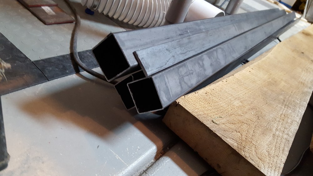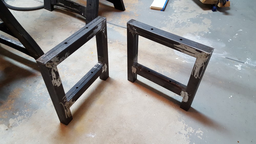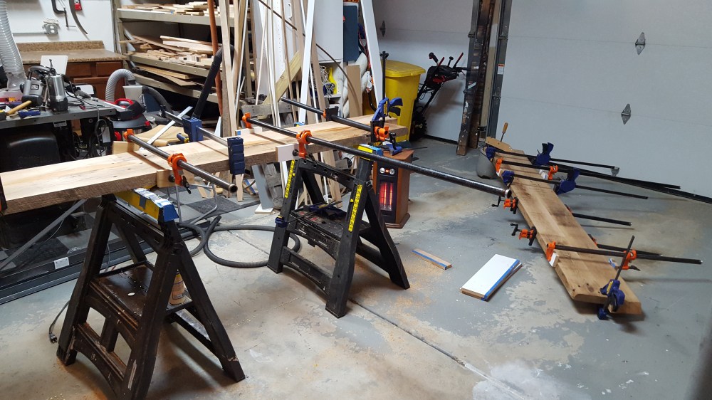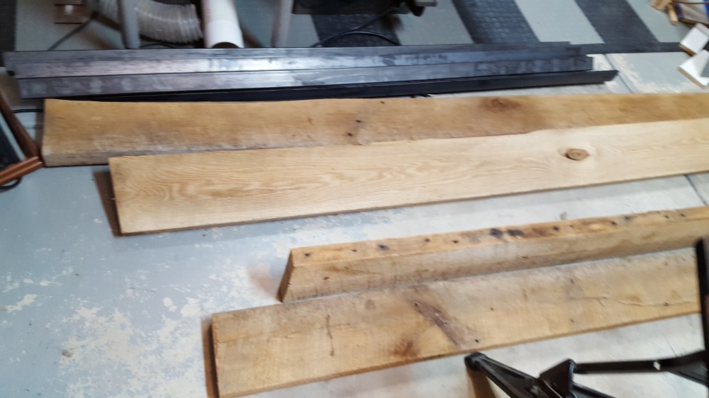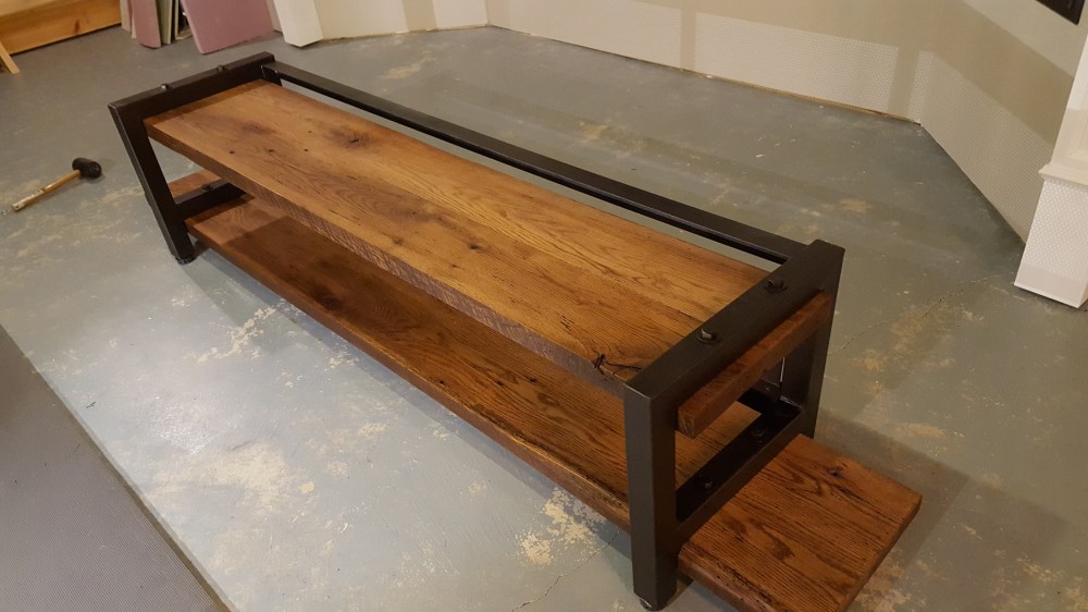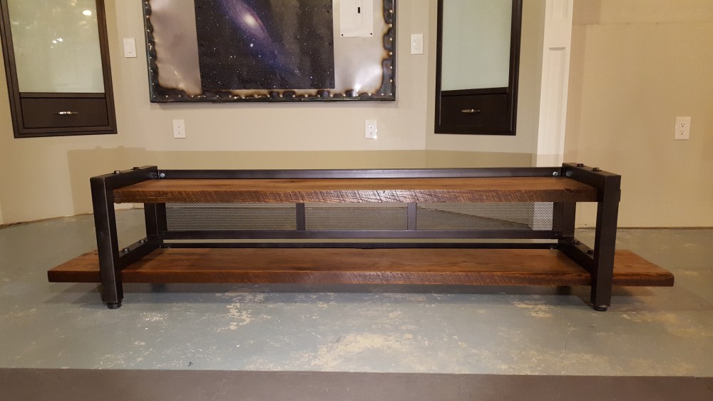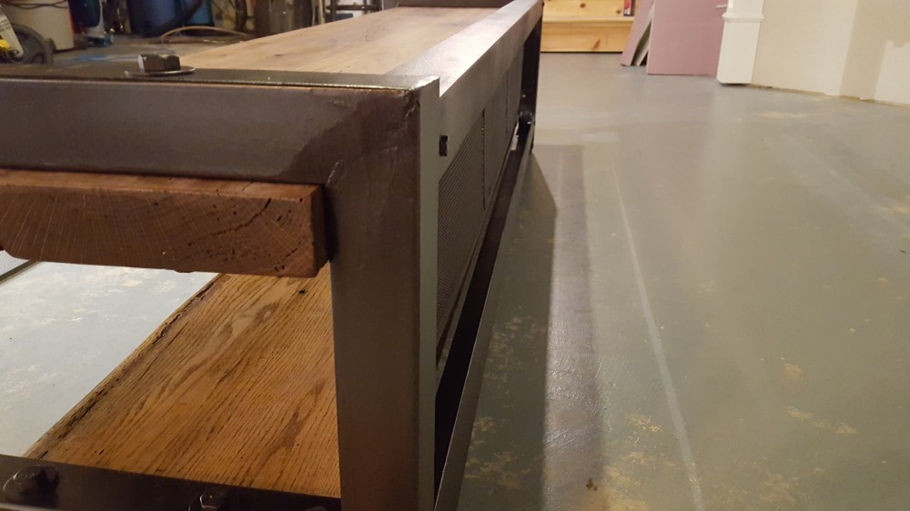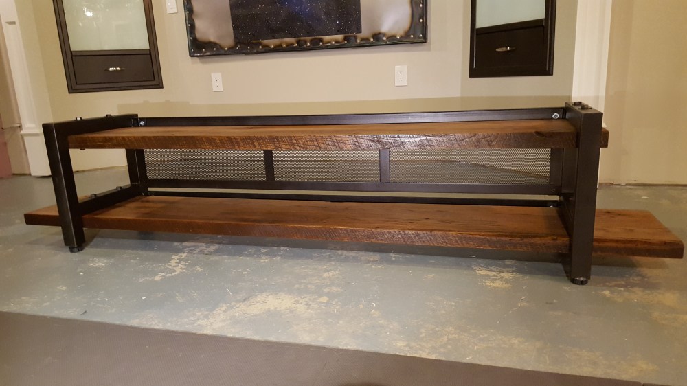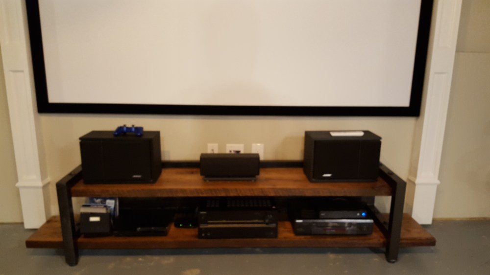 Once I finished the basement entertainment wall with the home theater screen, we needed an entertainment console that would hold all of the gear. I had wanted to create something that combined reclaimed wood and metal. I found someone that had torn down an old barn in Iowa and had these interesting oak boards. These boards had all kinds of character, but needs some attention too. I cleaned them up with mineral spirits to figure out how I wanted the grain to match up. I had recently purchased a planer, so this was the perfect time to use it to plane the surfaces of the wood. I also cut one clean edge to joint the two pairs of boards, but left the edges with all the character they had from the barn. I welded and sprayed the frames to hold the shelves, and created a mesh back and angle iron channels to hide all the wiring. The end result is a mix of metal and wood, and was just the look I was going after.