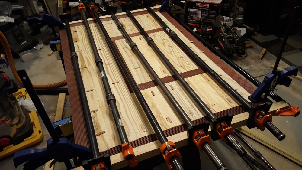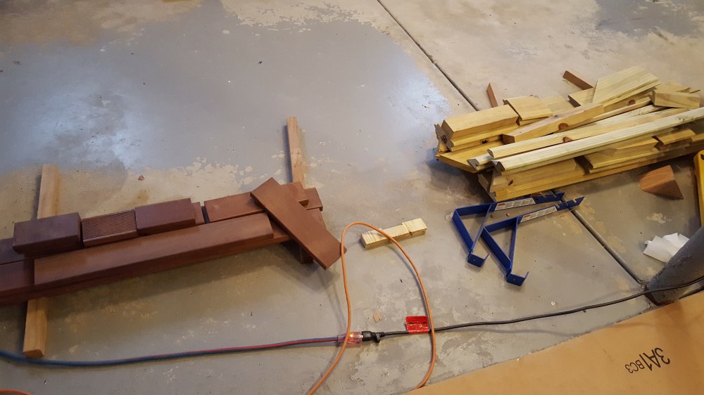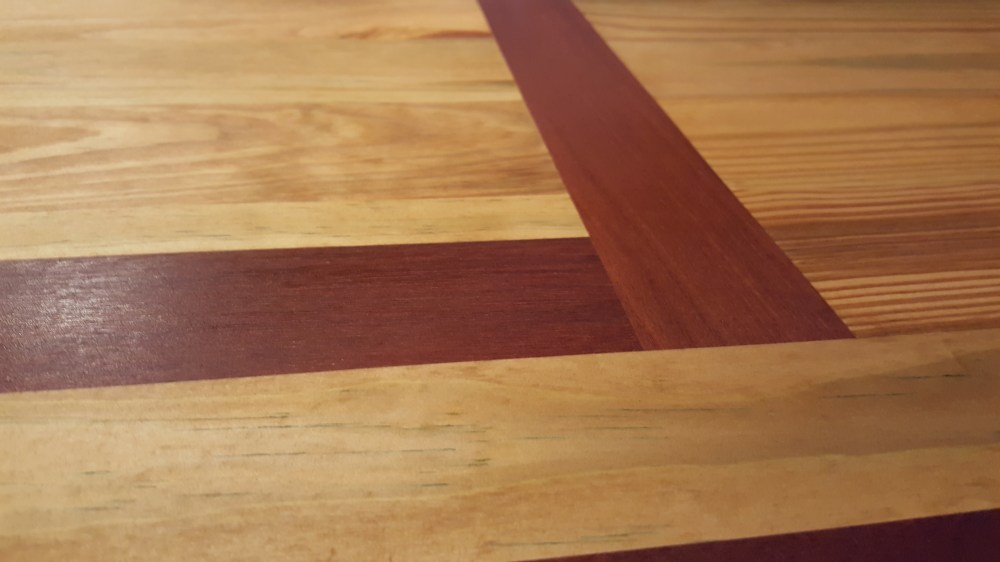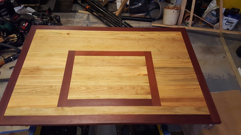 In the design phase of the patio, I actually increased the patio by a few feet outwards, specifically so I could fit a basketball goal, including enough room for college three point shots. Our driveway has a fairly significant incline, so it isn’t a good place for basketball at all, so if this Hoosier was going to get a goal, it had to be in the backyard. After spending all the time to create a wood structure that went well together, I had to consider whether I was willing to put in a glass backboard. I really liked the glass backboards, especially from Goalrilla, but wanted something that blended in. I ended up looking at the scrap wood leftover from the steps (Massaranduba) and the roof (tongue and groove pine) and decided, I can make a backboard that will blend the steps and the structure. I had to first take the scrap roofing and trim off the tongue and groove, and then plane the thickness down to match the massaranduba. Once completed, I joined all the scrap pieces together to create a pine backboard that leveraged the massaranduba for the square on the backboard, and the trim. Initially I finished it with a few coats of shellac, which turned out to be a mistake, and a later post will describe my efforts to repair and refinish the backboard after a few years of harsh winters. We do love this backboard though, and the adjustable goal has grown as the kids have progressed through their different leagues requirements from 8 feet, to 9 feet, and finally to regulation.