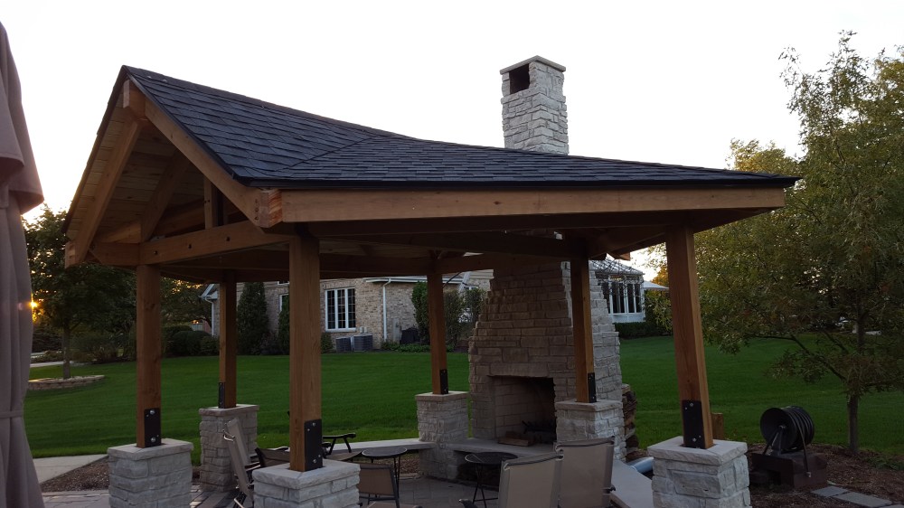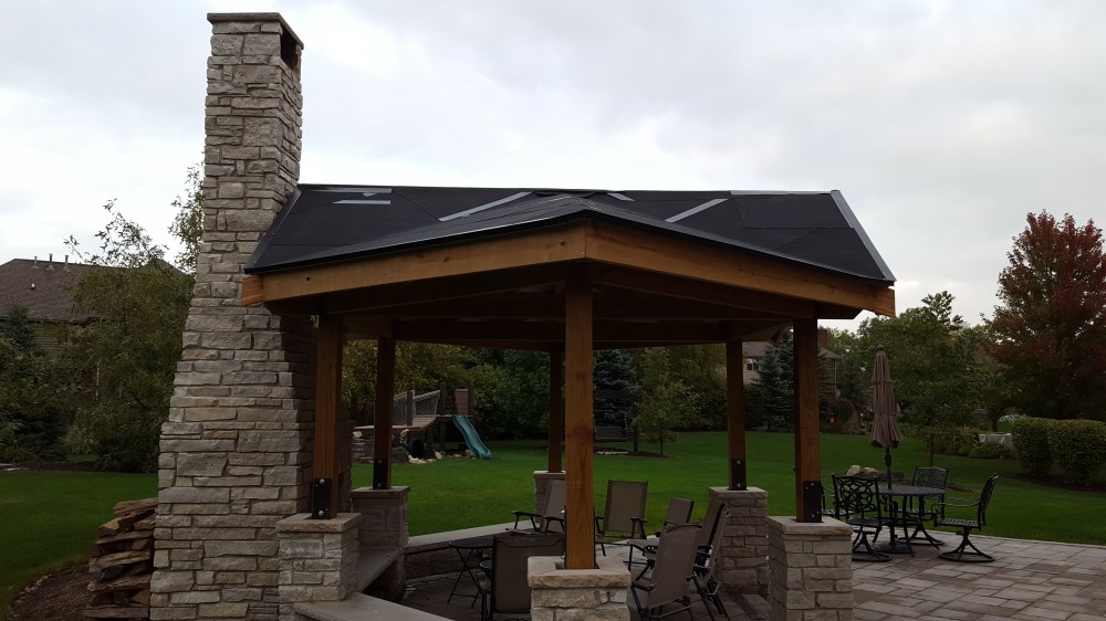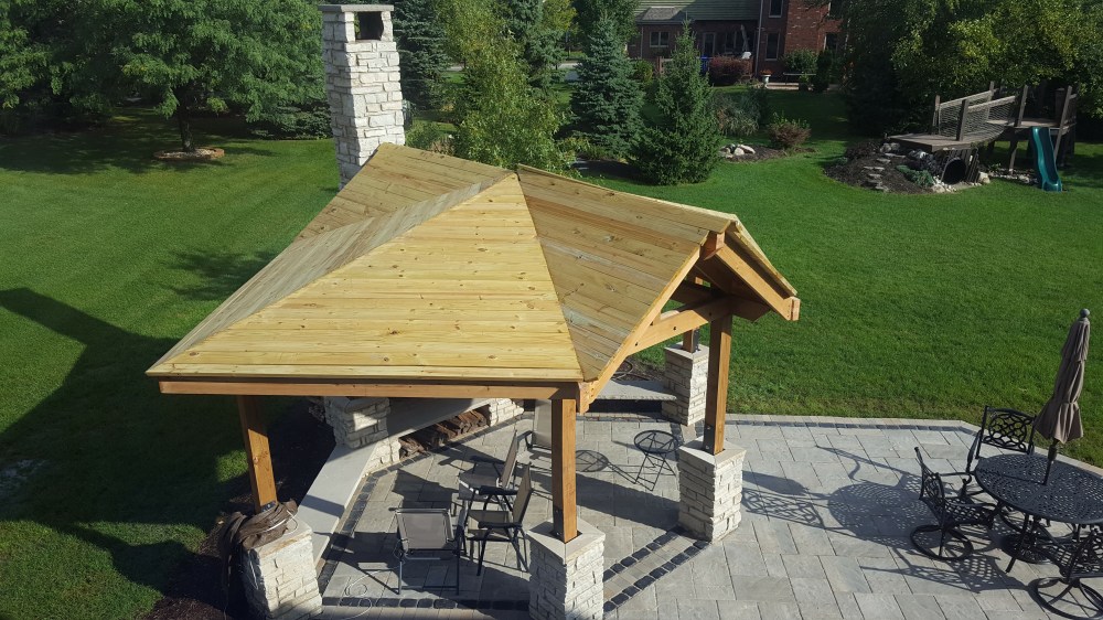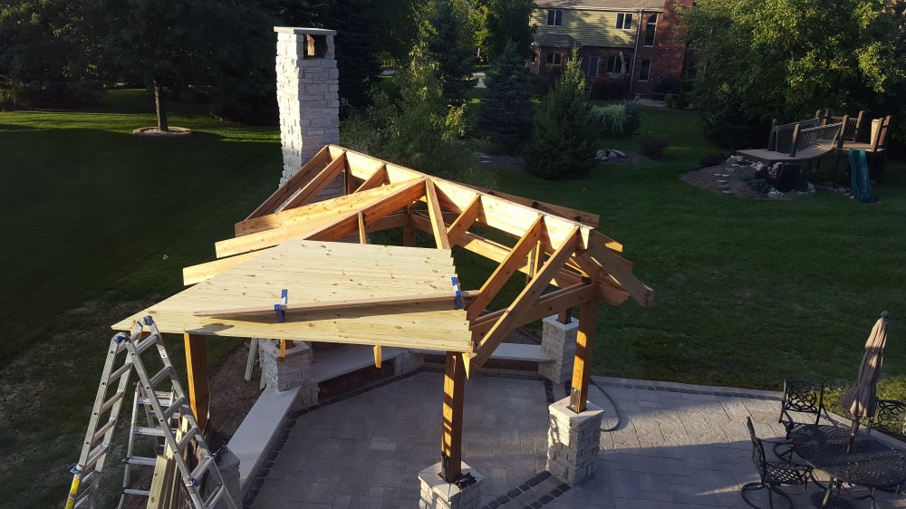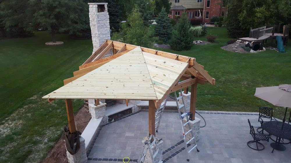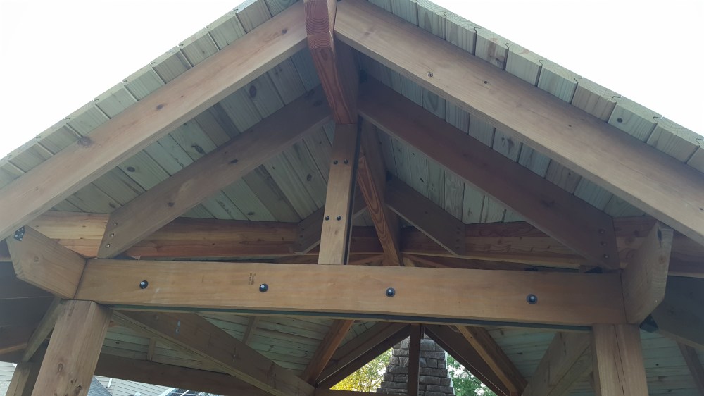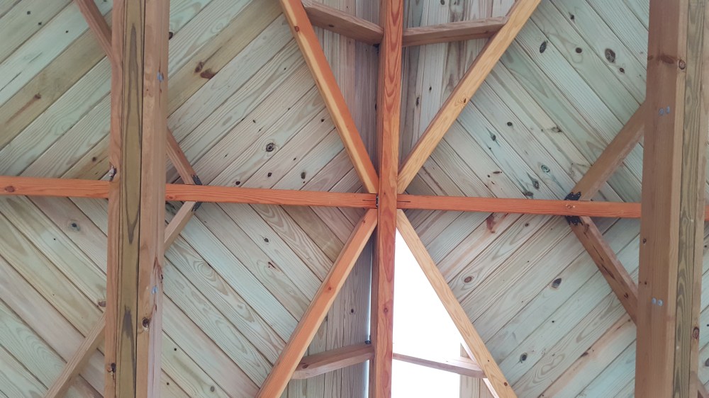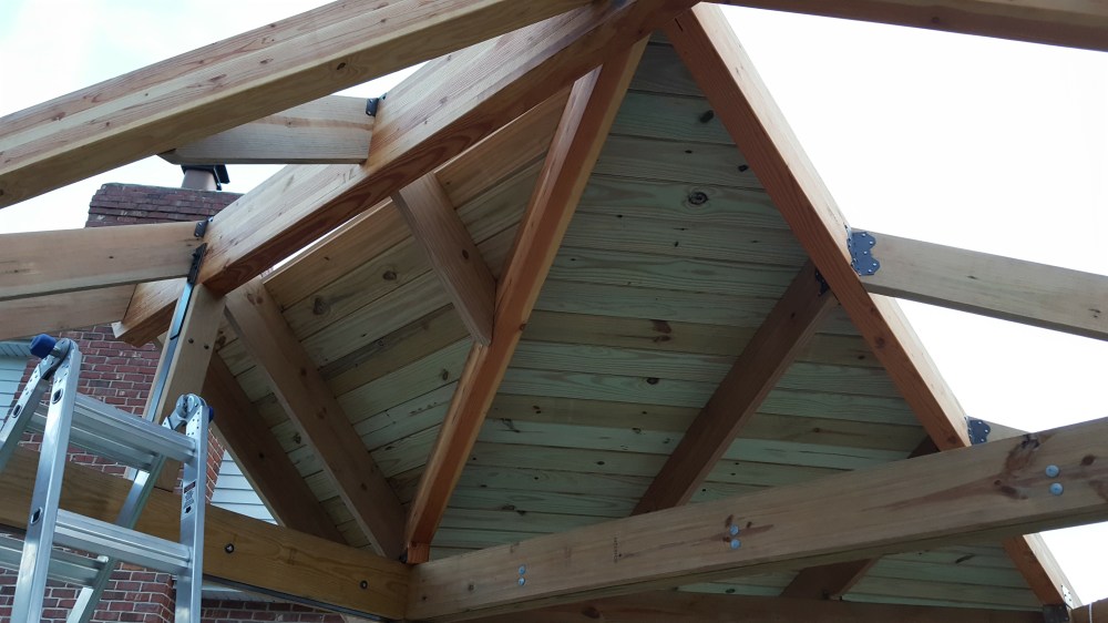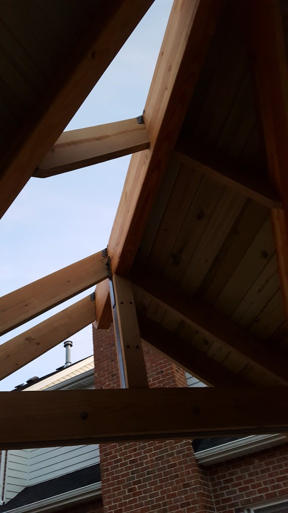 Once the framing was complete, next step was putting a roof on it! I used tongue and groove boards because I wanted that look on the inside. After debating several different ways of running boards, I decided while framing on a pattern that resembled a pattern in nature—a leaf. This made the angles a little more difficult during framing, but when putting the roof boards up, it actual helped a bit. I started working on one section, and anyone that knows me will attest that balance is not necessarily my strong suit, but I was determined to get the roof on, which required lots of time balanced on top of the structure. I was able to get into a groove of bringing a piece with one end cut at the right angle, temporarily placing, then marking the board for the final cut, then nailing in place. Each board is sized uniquely, so it was a lot of up and down the ladder, but it went pretty fast, and was satisfying to get each section completed. Once I had all the roof boards in place, I capped the top of the roof with copper flashing. Now ready for underpayment and shingles, I had all the roofing supplies ordered and delivered, set to roof. Jaime, sensing I was pretty worn out from many weeks doing construction in my spare time and tired of testing my balancing skills, wisely checked to see how much the company that installed our roof would charge, and when it came out to be reasonable, I agreed to let this part be done by somebody else, so I could focus on another set of projects, the stairs down from our house and the basketball backboard!