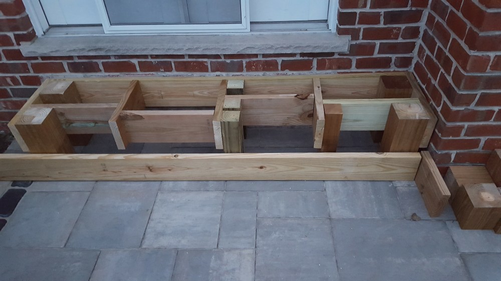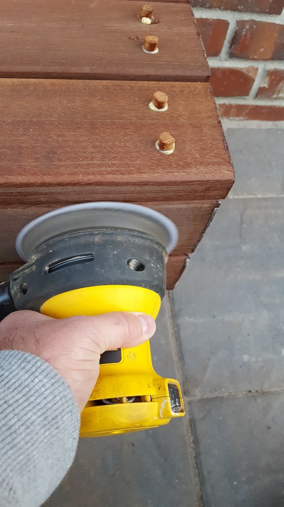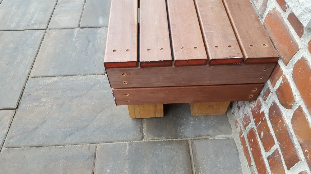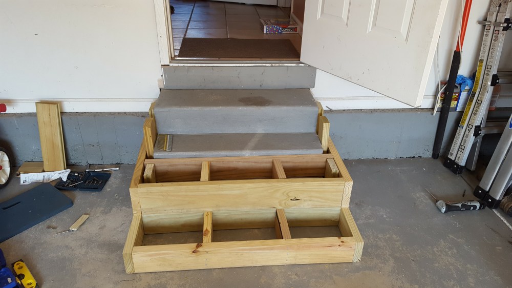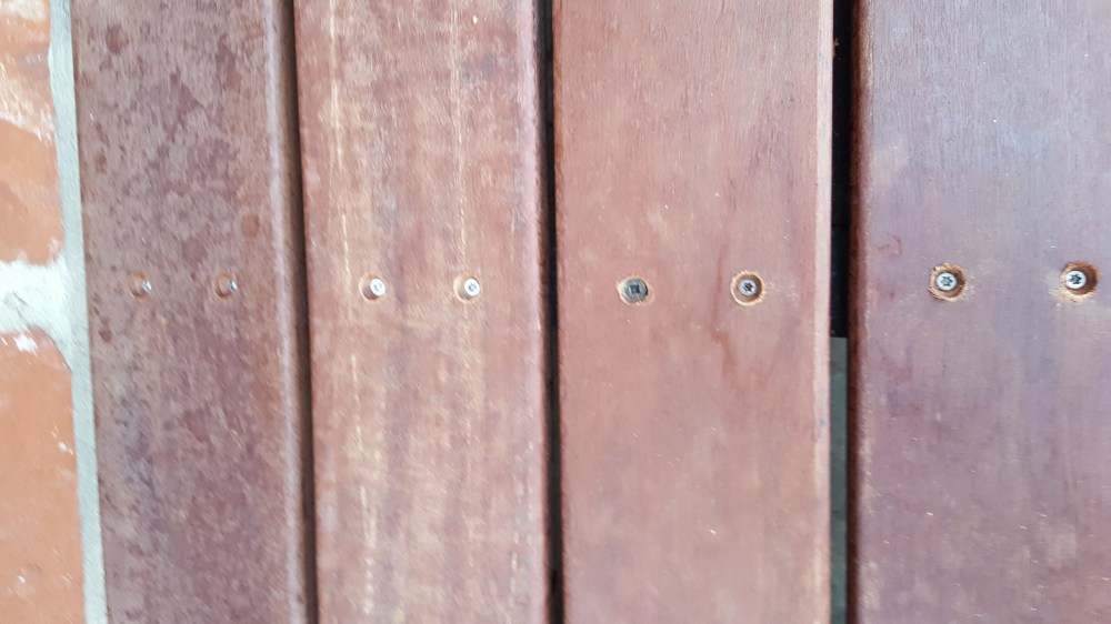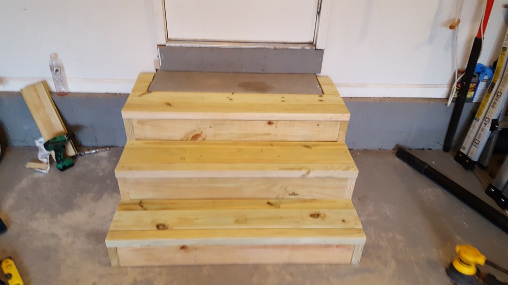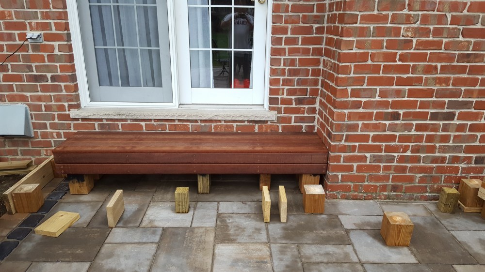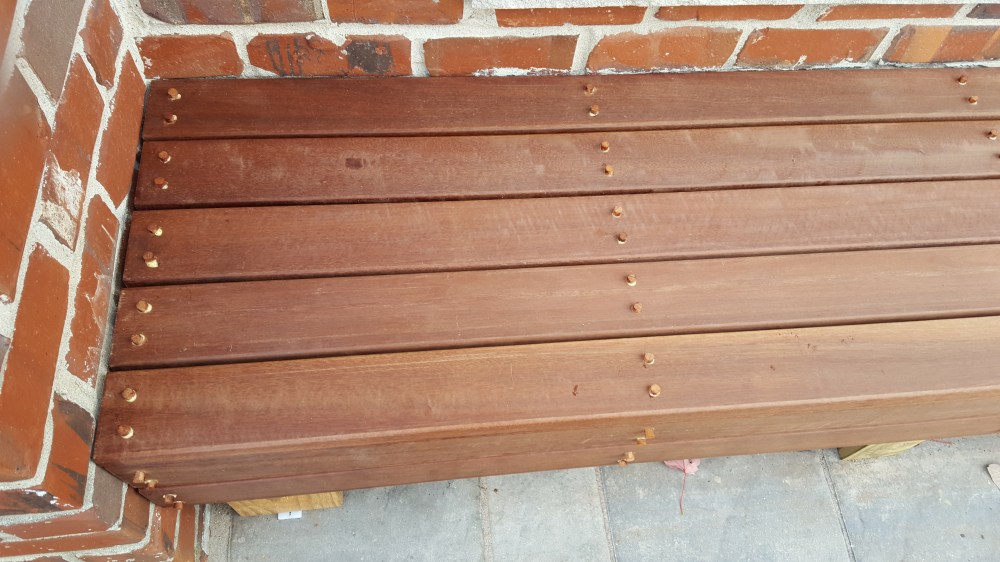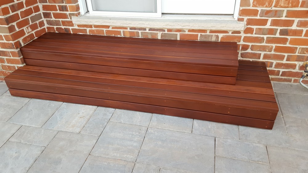 When our old patio was removed, they took out the concrete poured steps as well, which meant we had no steps for quite some time coming out of the back of our house. Inconvenient, and a little dangerous. Our original plan was to go with stone steps that mimicked the look below all of our windows, but those steps come in only one rise, and we would have had to have three steps, and by code, that would have necessitated a hand rail, so we ditched that plan. Thankfully, with the roofing in the hands of someone else, I could focus on designing and building the stairs. We needed to have it so there was only 2 steps, and then the step into the house. Luckily, you are allowed a range of stair rises to meet code, and I could custom build these stairs out of wood and stick with 2 stairs. But what wood to use? I wanted natural, so I did rule out Trex and like products. I did want it to be low maintenance and naturally beautiful, so I ordered samples of several hardwoods like Ipe. Immediately upon receiving the samples, one stood out—massaranduba. This beautiful Brazilian hardwood has a deep reddish brown color naturally, with a very smooth finish, and is nearly as hard as Ipe. I custom ordered the hardwood, and it was a little expensive, but since I was doing just steps and not a huge deck, decided to make the investment. Now, I ordered a hardwood installation kit with this, that came with screws, massaranduba wood plugs, gorilla glue and a couple of countersink drill bits. Well, this hardwood made quick work out of those countersink bits, and the T-25 driver bits. I broke or wore out so many, that I was making regular trips to Lowe’s for new ones. I honestly don’t know how many drill bits I went through. Once countersunk, the screws are covered by the massaranduba plugs, and then cut off and sanded down. I really like the look of the wood plugs, I think they add to the look. The end result greatly expanded the stepping surface coming out of our house, making it much safer than the old poured concrete steps. I ran the steps all the way under the doors up to the chimney, that way, if somebody needs something to hold onto, they can leverage the chimney. These steps were such an improvement, I decided to do a bonus project and use some of the scrap wood from the roof to build out our steps in our garage too!