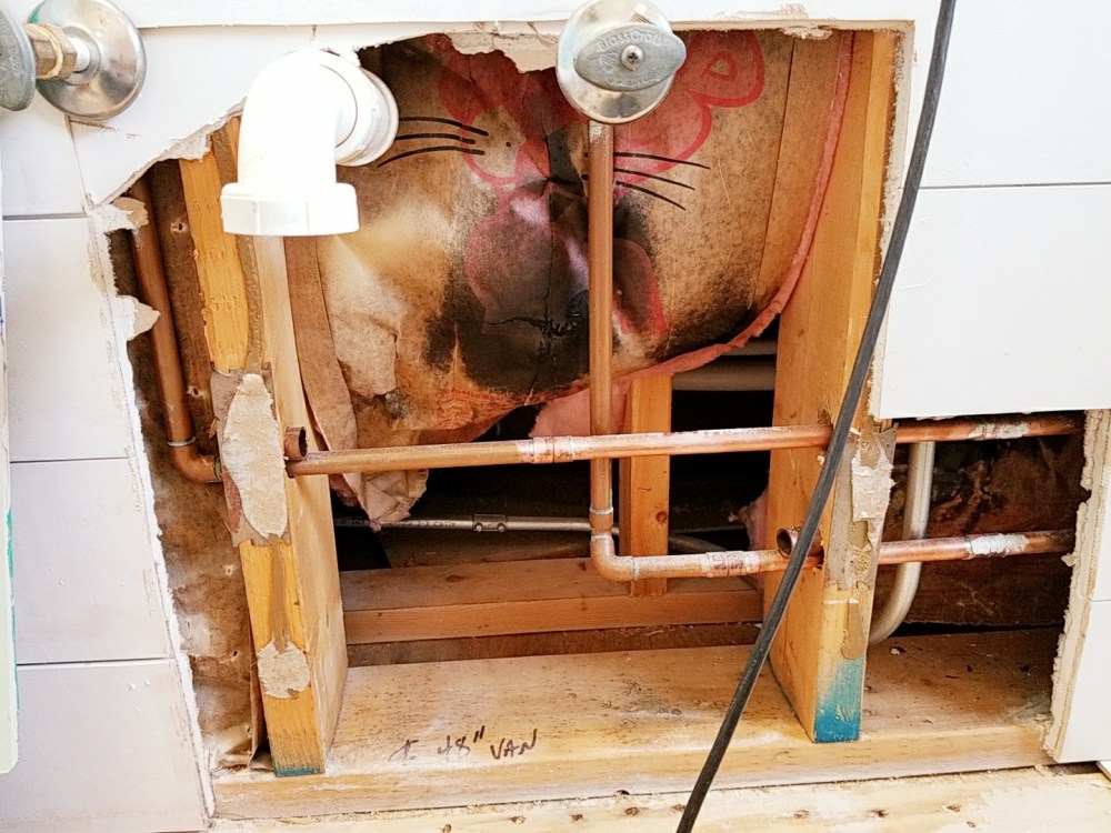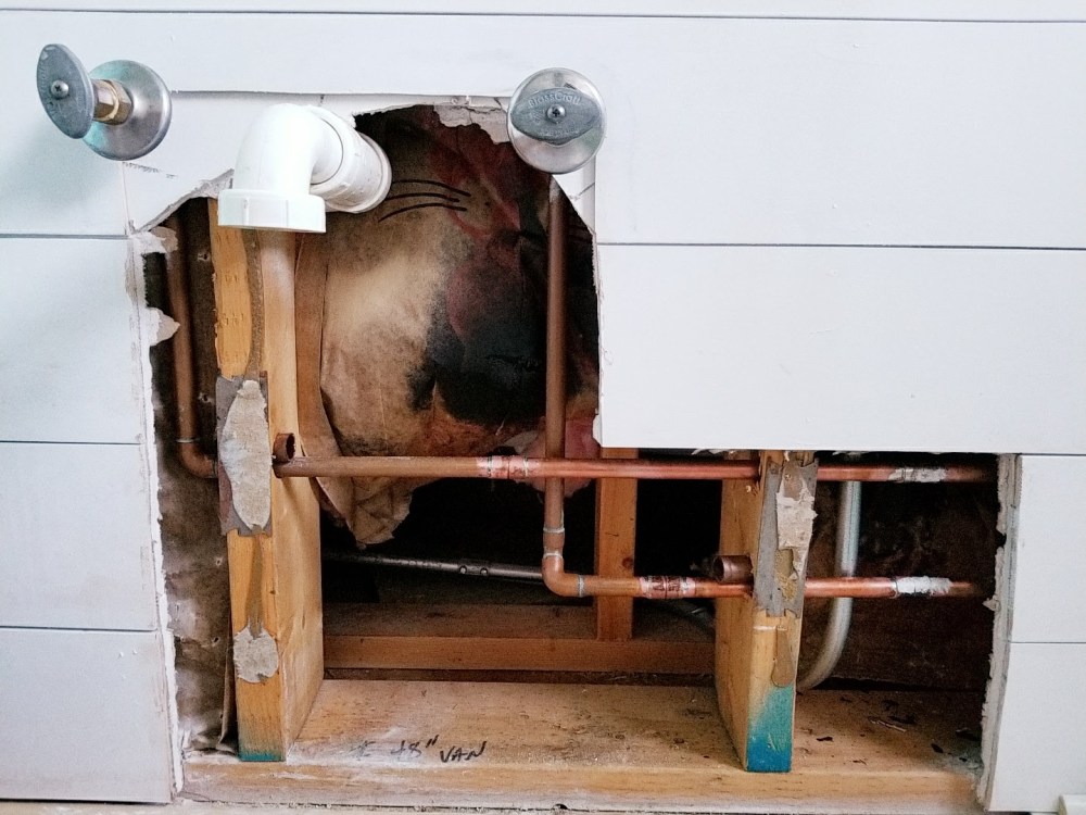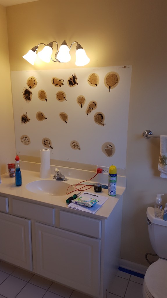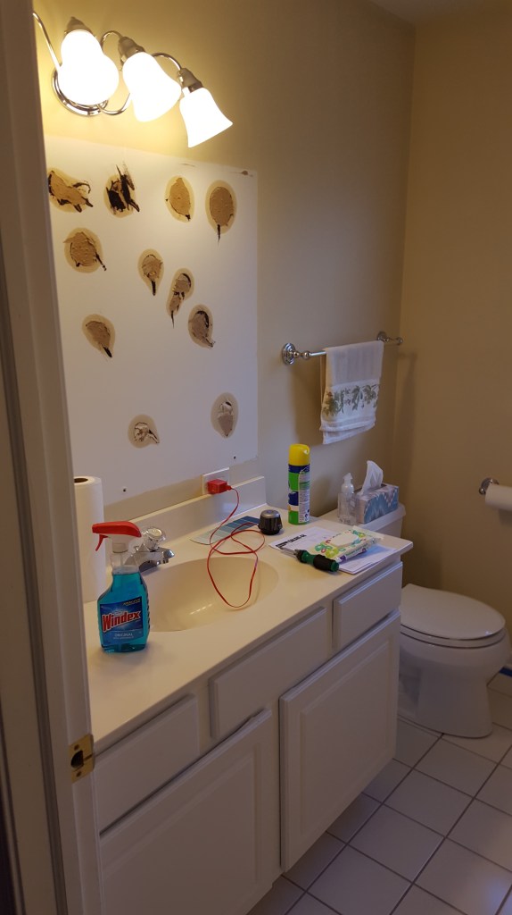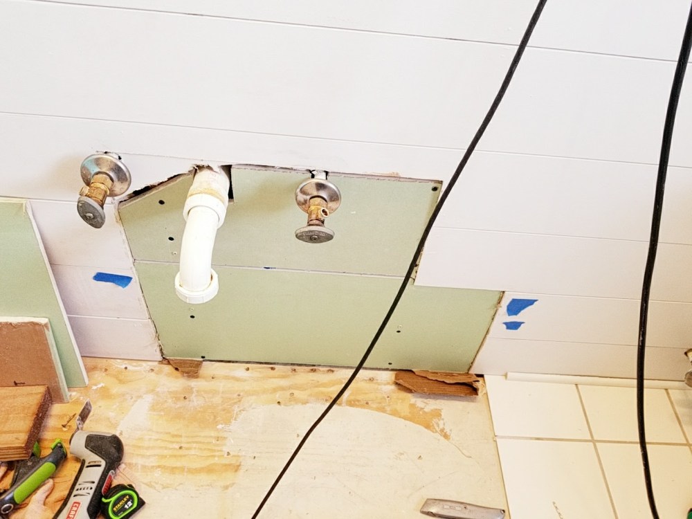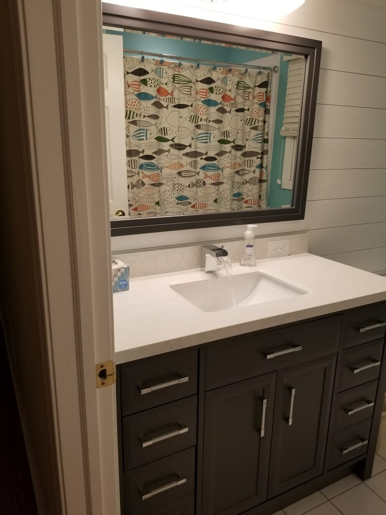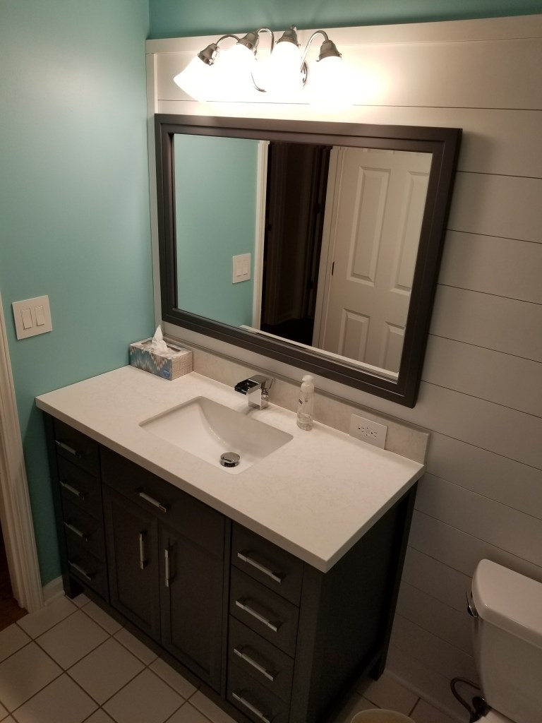 We had wanted to redo the boys bathroom, and after putting it off a few times, at one point we quickly coalesced on a design that included a tropical ocean water feel, a new dark gray vanity, and straight from Chip and Joanna—shiplap. After removing the old glued on mirror, I got started applying shiplap. I made pretty good progress through the project, but about half way up the wall, we realized water was coming out of our kitchen lights. I somehow had managed to hit not one, but two water lines with one nail. Thanks to my father-in-law for helping repair the water line in a pinch so we could get the project back on track.