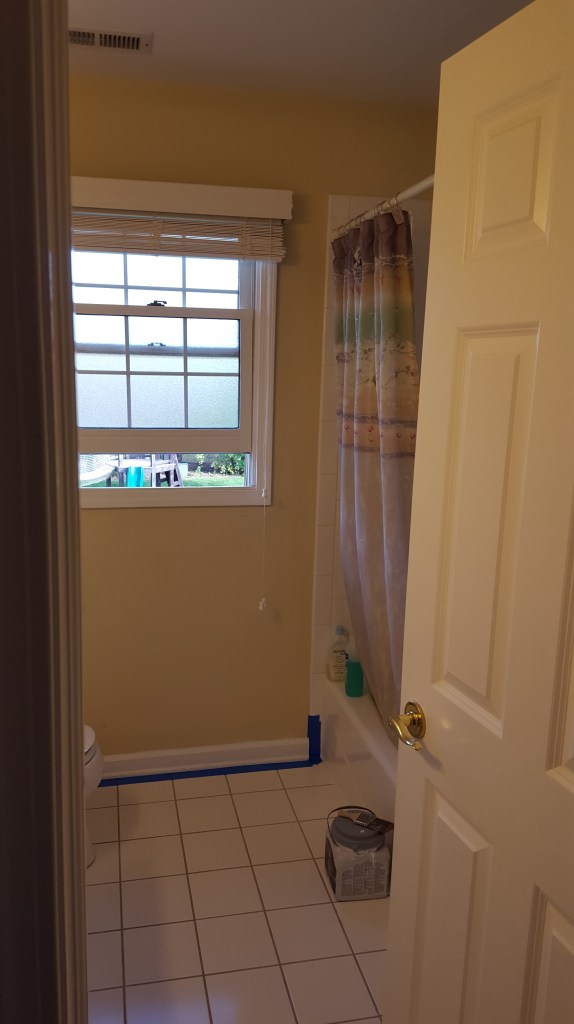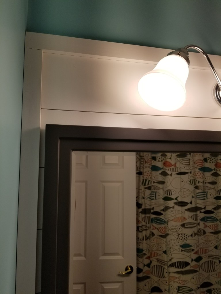 I didn’t want to shiplap the whole bathroom, but wanted the main wall to incorporate shiplap, so I created a frame, and stopped a bit before the top so the blue paint color would carry through across the full room. We accented the look with sea inspired decorations and a canvas look fish shower curtain.