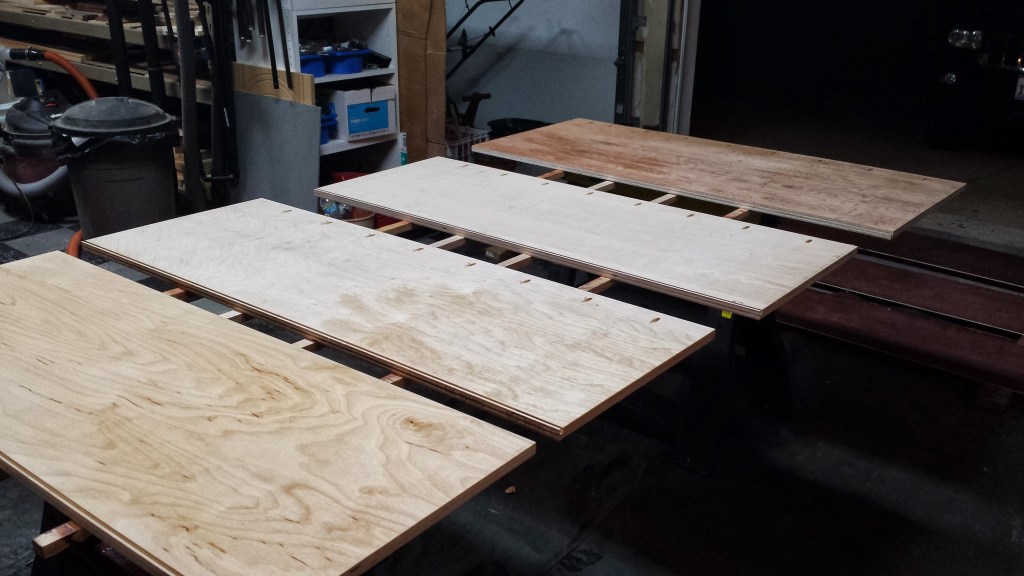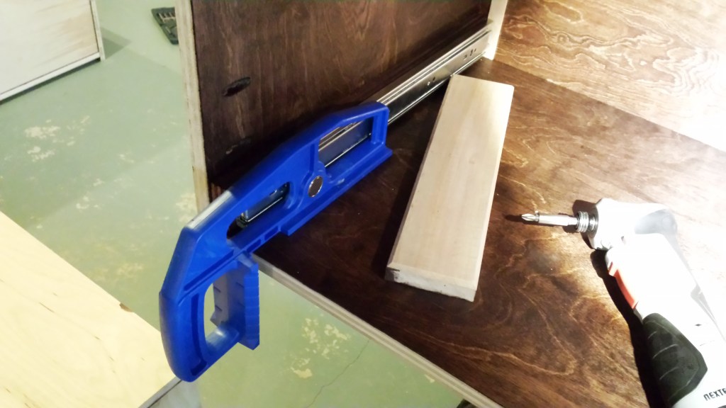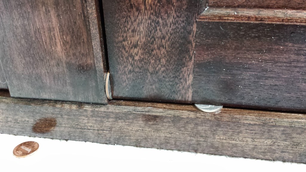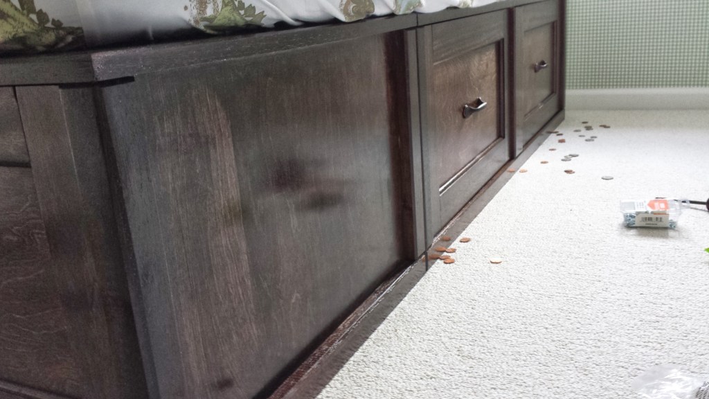 I used rail and style router bits with a plywood insert to make the drawer fronts, and I aligned the drawer fronts using a high tech tool–ok, just coins–but the coins did help space out the drawer fronts evenly and allowed me to get the alignment set. This bed was good opportunity to build drawers, and the result is a set of useful larger drawers under the bed that are sturdy enough to hold just about anything, whether it is toys, books, cloths, or whatever else kids can dream up.
