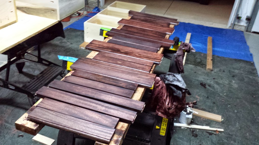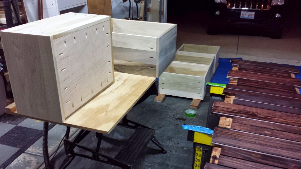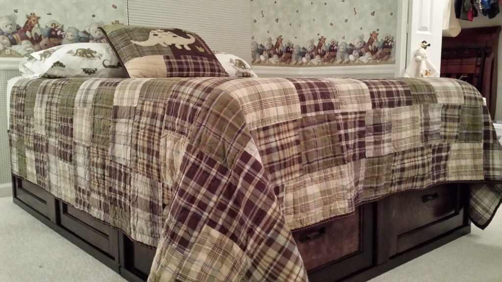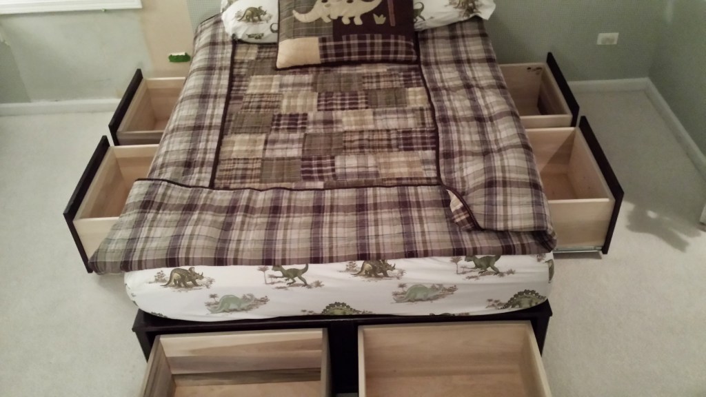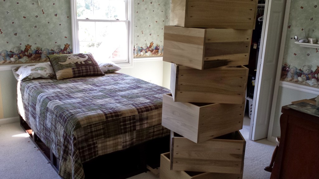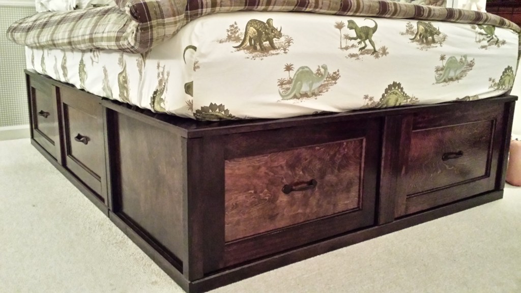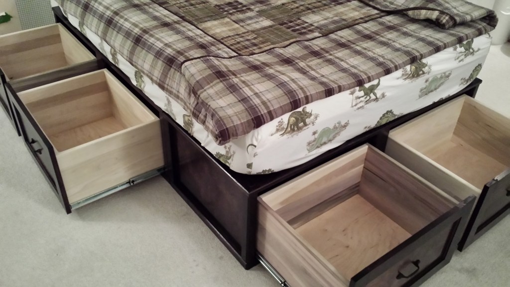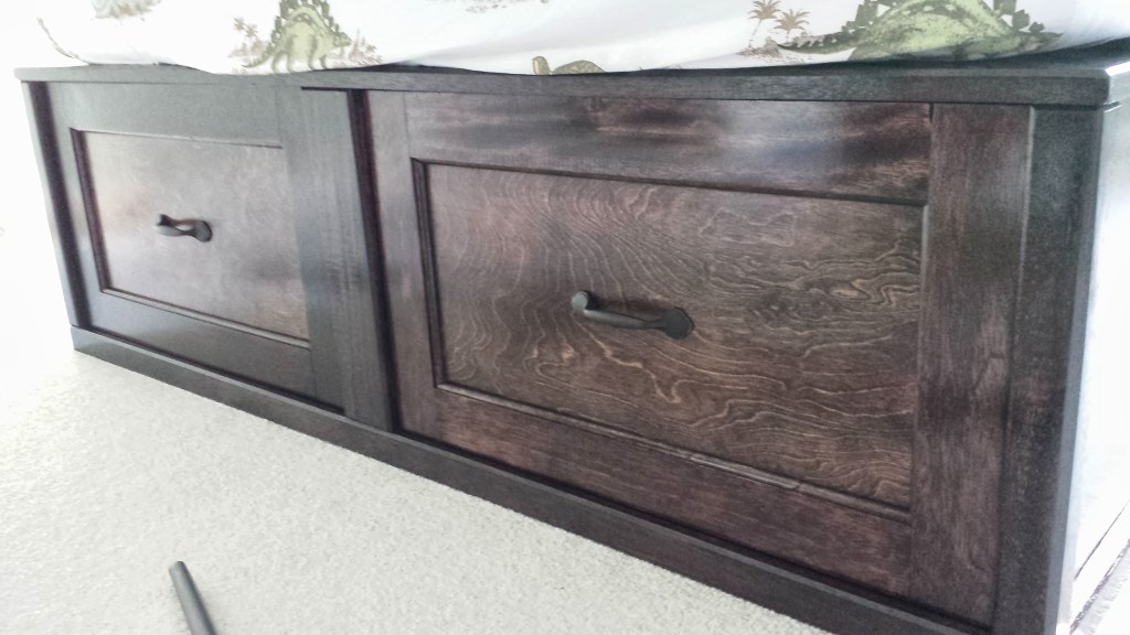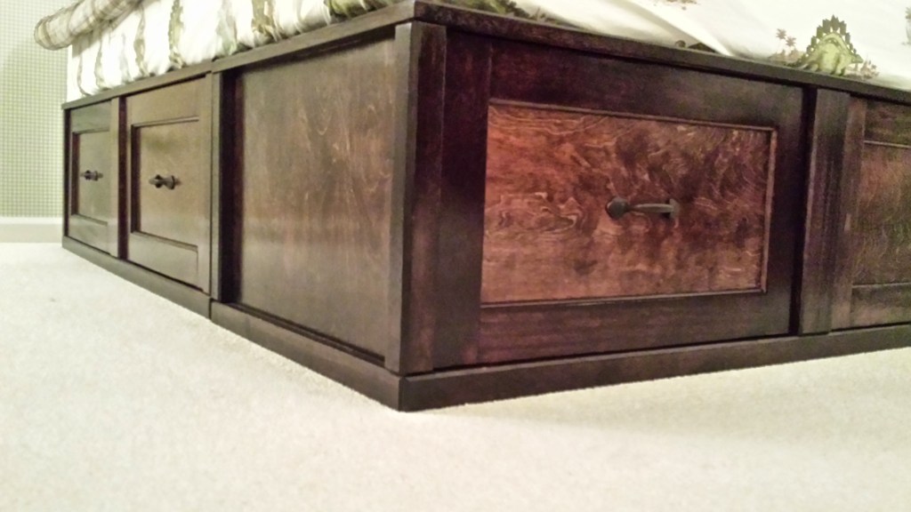When Matthew was close to transitioning to a regular bed, we wanted to create something with storage. We liked a style of bed with drawers on both sides and on the end. I had really wanted a chance to do something with drawers on a big scale, and this bed was an opportunity. The idea was to create the base for the bed in three sections, left, right and end, to make it easier to disassemble if ever needed. With previous success working and finishing mahogany, decided to use this wood for the frame of the bed.